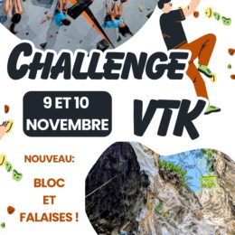 Le challenge VTK revient cette année avec une nouveauté! Deux jours d’escalade, en falaises et en bloc pour doubler le plaisir 😉Par équipes de 2, 3 ou 4, venez tenter de grimper 200 mètres de voies et enchaîner nos blocs. Possibilité d’inscription individuelle pour les enfants en bloc. Retrouver les détails dans les bulletins d’inscription…